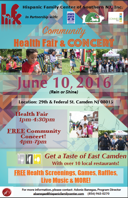 Spring time is here, and the Hispanic Family Center of Southern New Jersey, Inc. is revving up for the annual Community Health Fair and Concert. In partnership with St. Joseph’s Carpenter Society, La Parada San Juan Bautista’s celebration of culture and tradition, and Connect the Lots, this impactful event provides hundreds of families from the community with education, health-related information, free health testing opportunities, and a chance for families to discover services within the community that can help lead healthier lives. View the event flyer below: