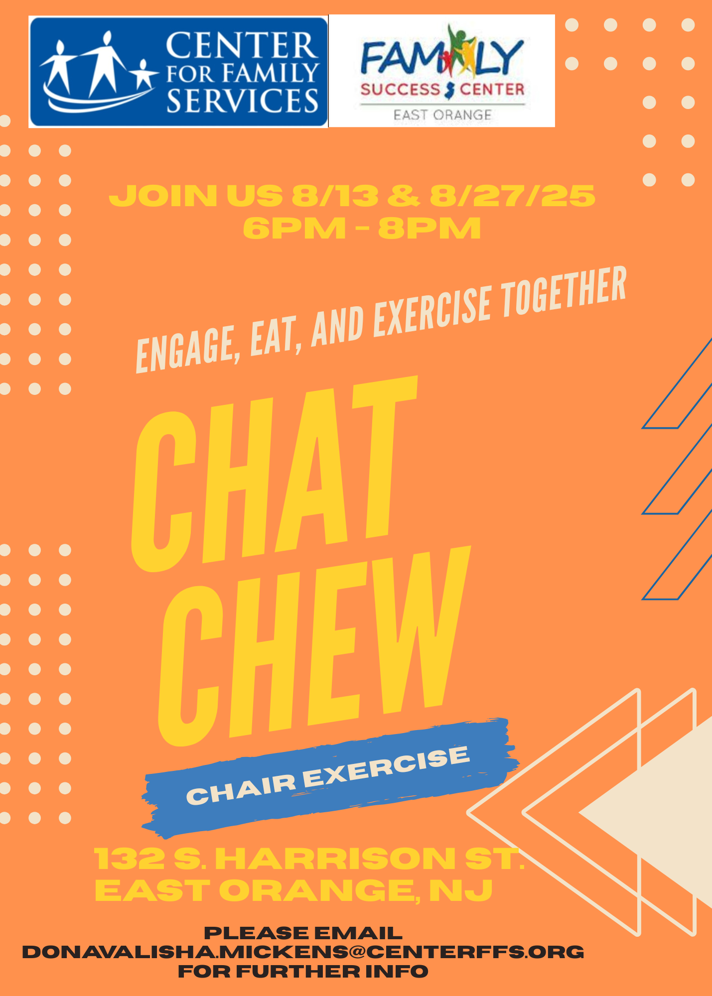 Wellness Wednesday - Join us on Aug 13th for a fun filled night of good conversation and good food, followd by some easy to learn chair exercise routines. From 6pm - 8pm.