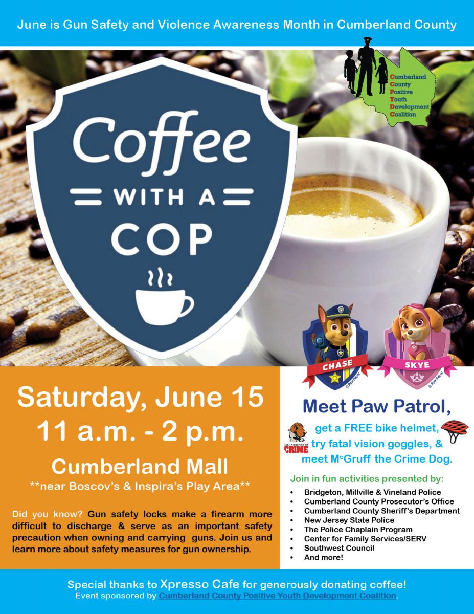 The Cumberland County Positive Youth Development Coalition (CCPYDC) is hosting Coffee with a Cop at the Cumberland Mall on June 15 in recognition of Gun Safety and Violence Awareness Month. This event gives community members an opportunity to meet local police officers and interact in a casual setting. Visit the Paw Patrol, get a FREE bike helmet, try fatal vision goggles, and meet McGruff the Crime Dog. SERV advocates will be there too, so make sure you stop by to say hi.