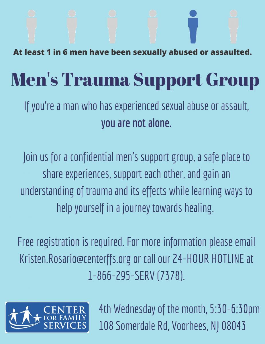 If you're a man who has experienced sexual abuse or assault, you are not alone. Services Empowering Rights of Victims (SERV) offers a support group specifically for male survivors of sexual violence. It is a place where participants can confidentially share their experiences and gain an understanding of trauma and its effects. Start your journey to healing by joining us from 5:30-6:30 on the fourth Wednesday of each month at Living Proof Recovery Center. Your participation will help you learn healthy coping strategies as you become part of a strong support system.